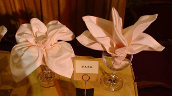 宴會主賓、主人位上的餐巾花,應選擇較名貴、疊工精細、美觀醒目的花型,其目的是突出主人、尊敬主賓。