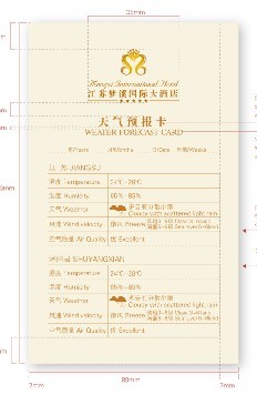 對于常對外出差的商人、旅客們來說,每天的天氣情況是必知的重要信息,為了方便出行不耽擱時間,天氣變化是最讓人擔心的事。因此,酒店在服務上有設計最溫馨天氣預報卡帶給每一位客人們,告訴他們今天的天氣氣象如何?讓客人做好是否出行的安全準備,不必擔心在出行后天氣狀況如何的問題上。
