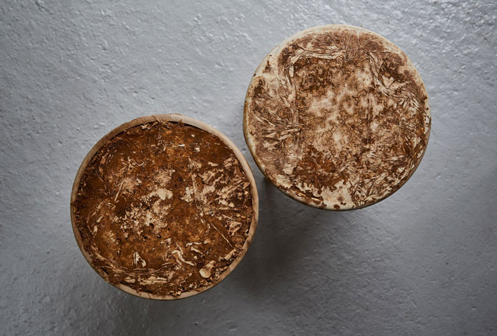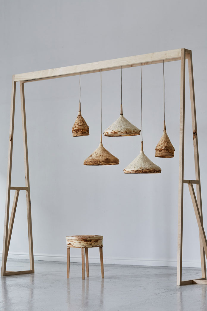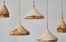Mushroom mycelium daily necessities design, using the weathered interior design created with mushroom mycelium, studied the potential of article VI design mushroom mycelium in contemporary interior design. Use this fungus material to make a series of daily necessities. Their "Mycelium + Wood" series includes various stools and lights. Each element has a suede-like texture.
